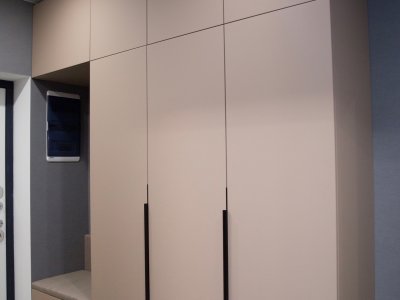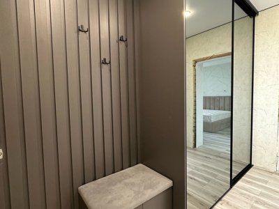 Функциональная и стильная прихожая с современными панелями для размещения одежды, большой шкаф купе и удобная банкетка.
