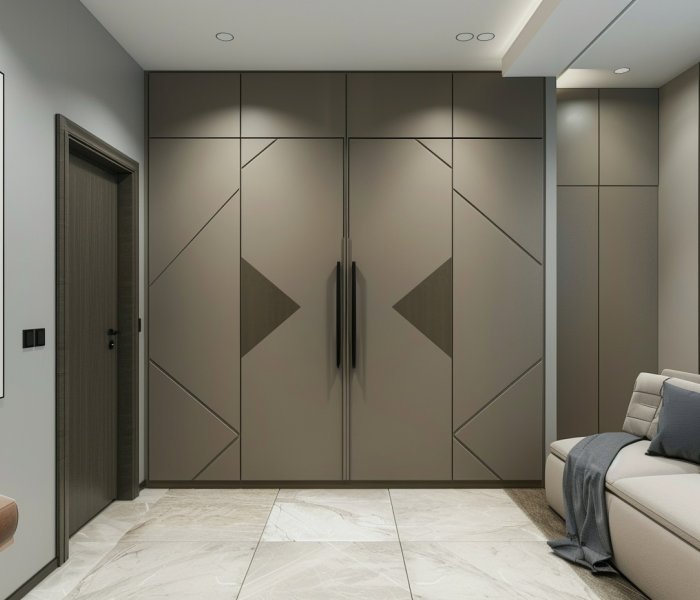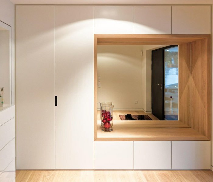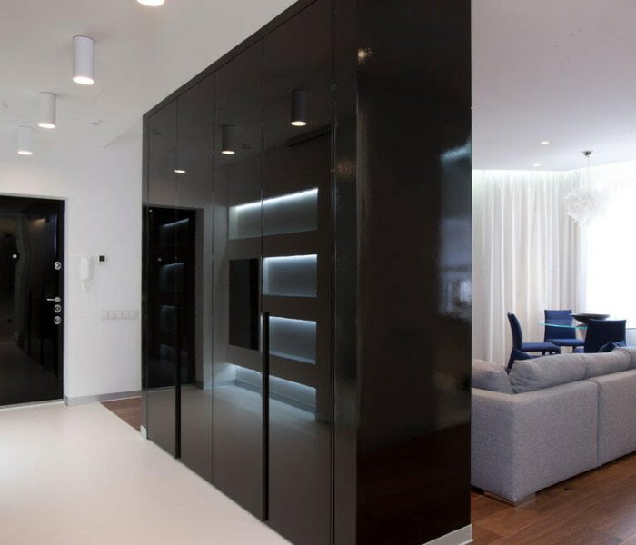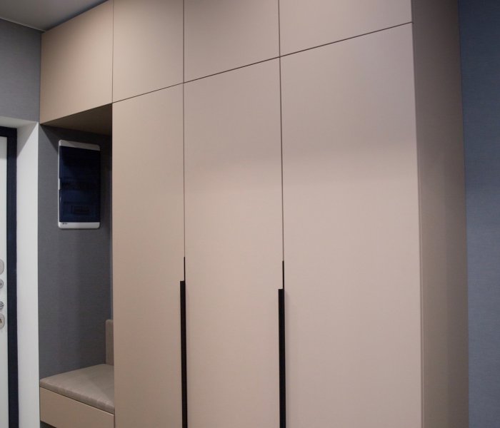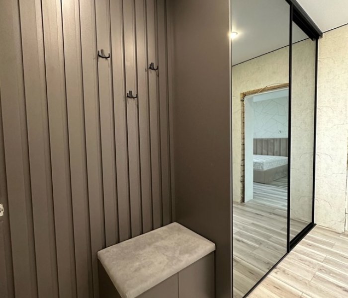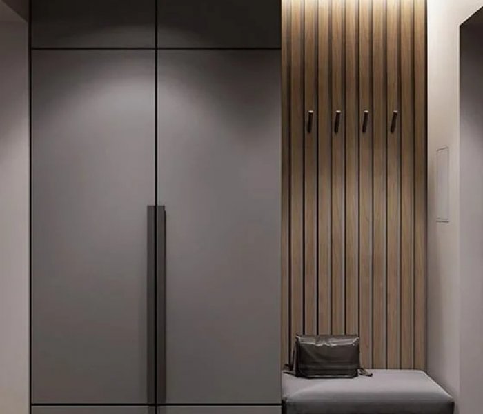 Функциональная и стильная прихожая с современными панелями для размещения одежды, большой шкаф купе и удобная банкетка.