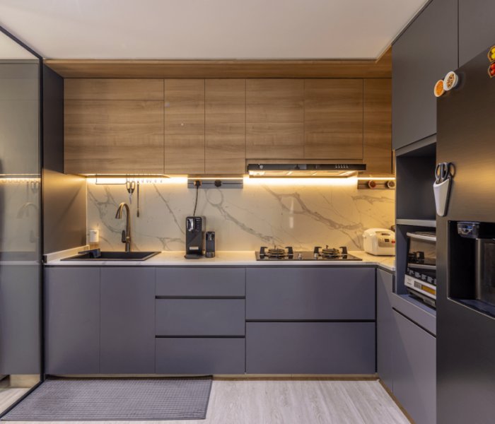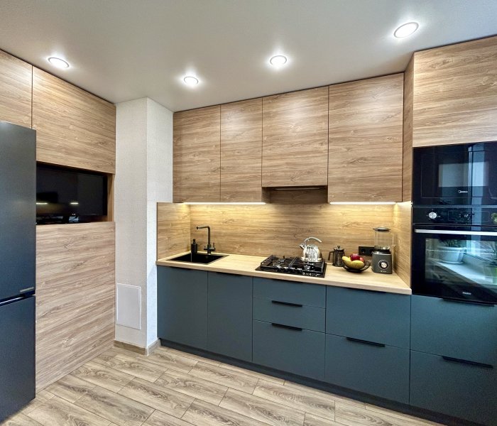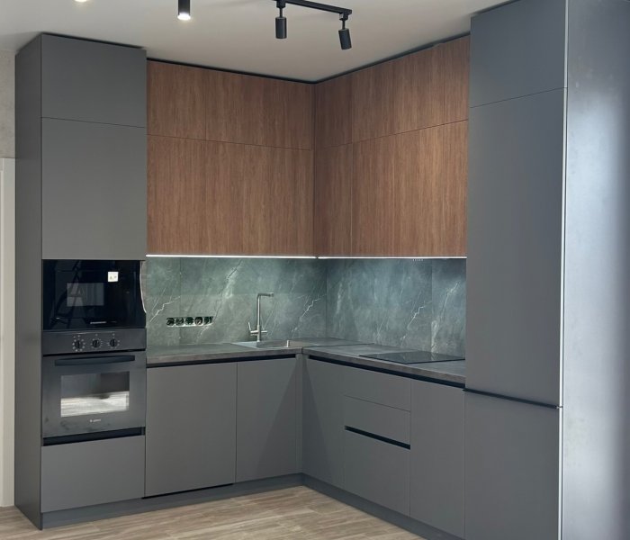 Материал фасадов - AGT. Кухня выполнена на контрасте: верх (под деревянный шпон), низ (глубокий благородный серый цвет). Ручки в современном стиле в скрытом исполнении. Фурнитура премиальная - BLUM.