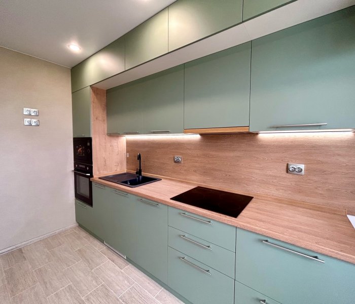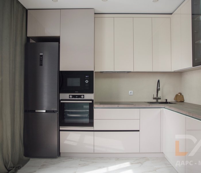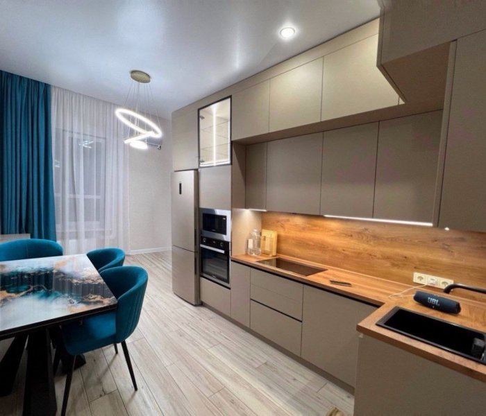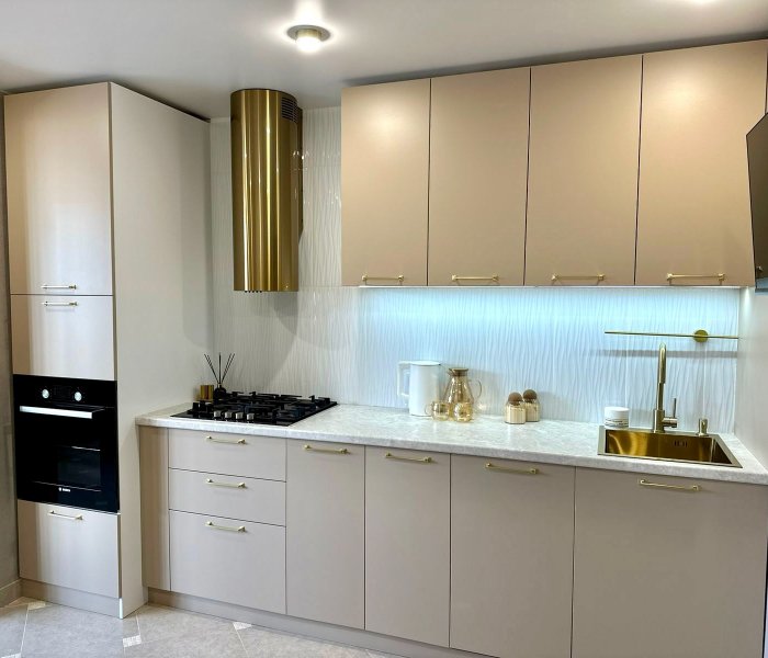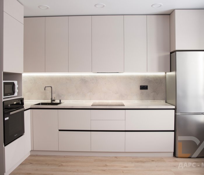 Красивая и современная кухня для замечательной хозяйки. Трехуровневая прямая кухня. Фасады AGT. Столешница - Slotex. Фурнитура BOYARD. *Стоимость указана на момент публикации и подлежит уточнению при конкретном заказе. Кухонное оборудование, бытовая техника в стоимость не входят. Данное объявление не является публичной офертой.