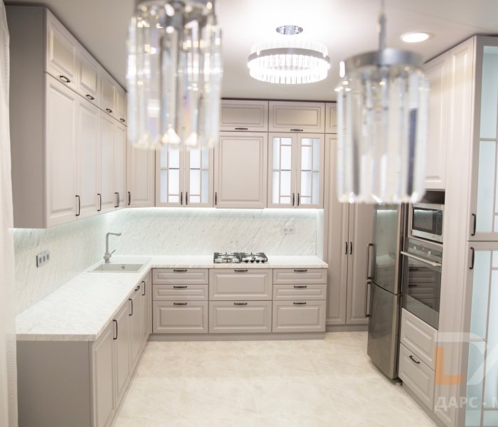 Кухня с эмалированными МДФ фасадами. Окраска в цвет дизайна заказчика. Фрезеровка фасадов. Накладные ручки. Фурнитура Boyard-премиум. В дизайне использованы глухие дверки и стеклянные с встроенной подсветкой полок. Особый шик кухне придает вертикальный торцевой шкаф с остеклением и подсветкой. *Стоимость указана на момент публикации и подлежит уточнению при конкретном заказе. Кухонное оборудование, бытовая техника в стоимость не входят. Данное объявление не является публичной офертой.
