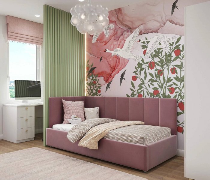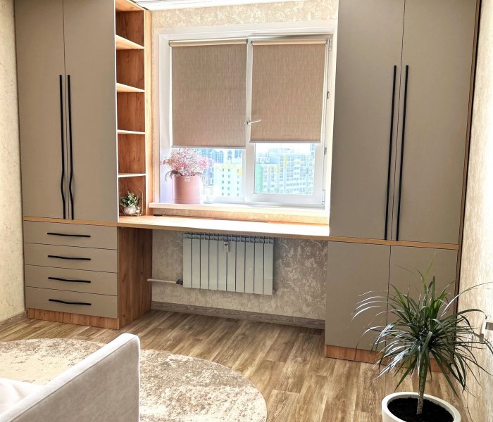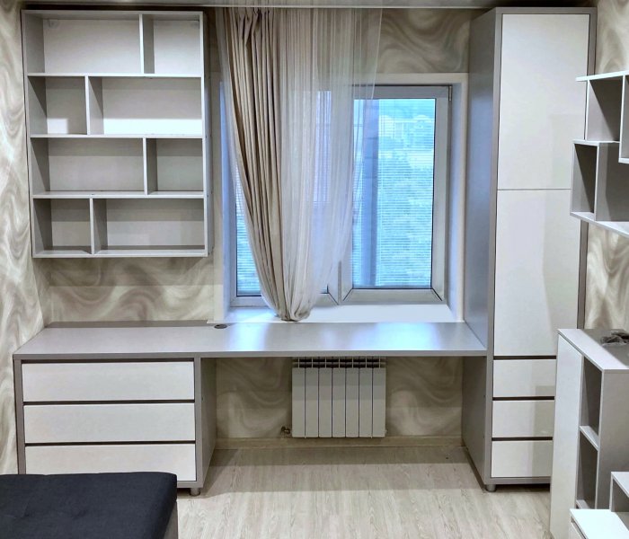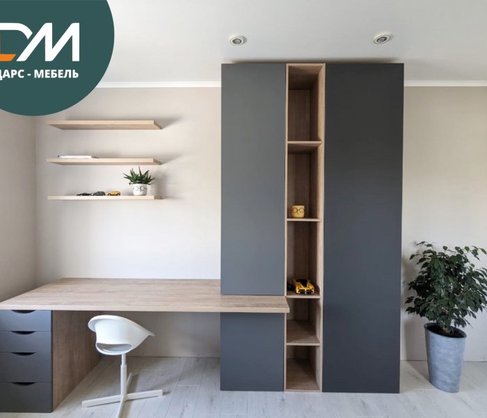 Детская комната: двухстворчатый шкаф, с открытой секцией с полками, совмещенный со столом и тумбой на 4 ящика). Отдельно предусмотрены дополнительные навесные полки. Скрытые ручки. Фасады из AGT. Фурнитура - BLUM.