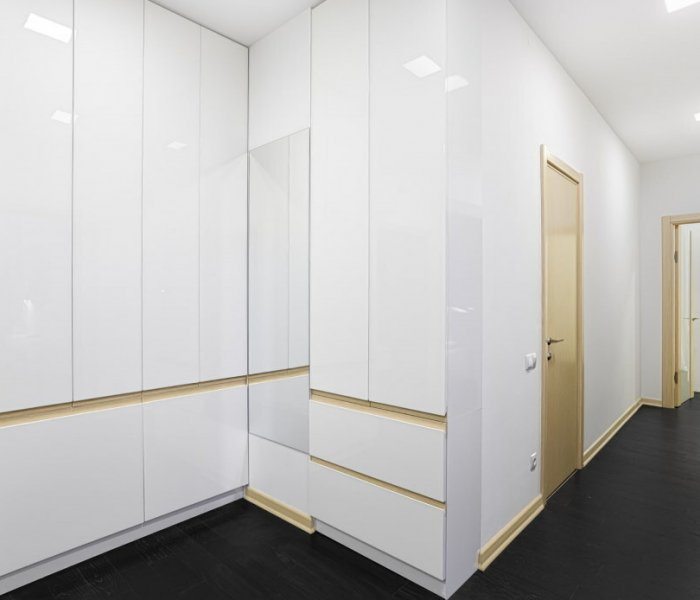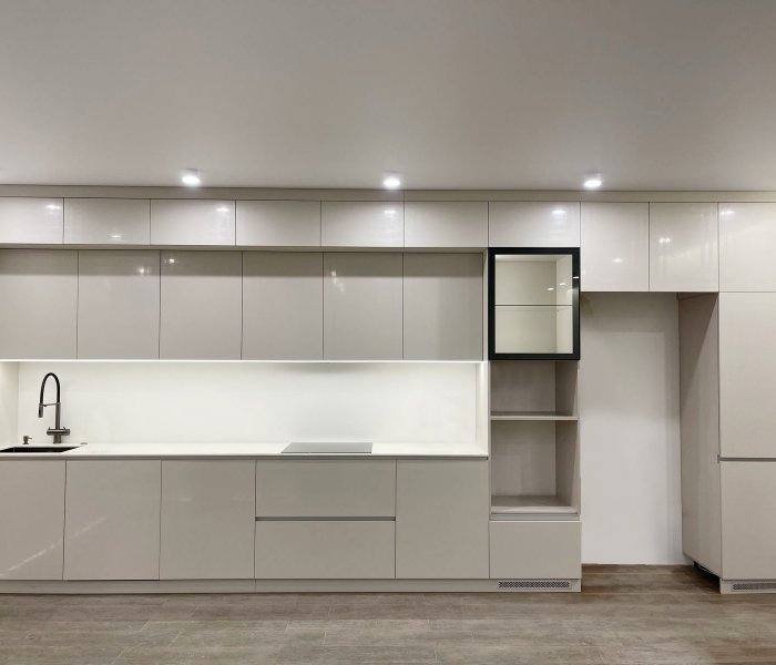 Глянцевые шкафы (МДФ, эмаль) смотрятся очень стильно и дорого. Двери на магнитных толкателях и скрытые фрезерованные ручки.