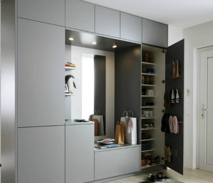 Шкаф в прихожую в стильном сером цвете, имеется большая ниша с зеркалом. Предусмотрено множество отделений размера под разнообразные задачи хранения. Фасады из AGT.