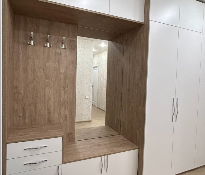 Дизайнерская прихожая, состоящая из двухстворчатого шкафа, большой ниши с зеркалом и удобными верхними и нижними ящиками. Такж в комплект входит комод. Фасады выполнены из AGT.