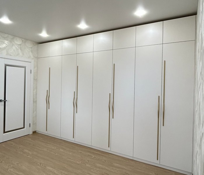 Размер шкафа: 1,2*2,5 м. Пуфик: 0,8 м. Скрытые ручки. Цена (в зависимости от материала): Материал фасадов ЛДСП - 47000₽ Материал фасадов AGT - 69000₽ *Цена указана на момент публикации. Может меняться. Не является публичной офертой. Актуальную цену уточняйте у наших администраторов.