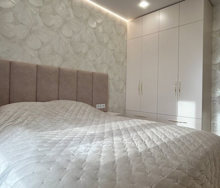 Шкаф 4-х створчатый: ЛДСП "Миндаль". Фурнитура FIRMAX . Стоимость образца на фото - 75000 руб. Прикроватные тумбы: ЛДСП "Миндаль". Фурнитура FIRMAX , Стоимость образца на фото - 14000 руб (пара). Кровать: Увеличенное мягкое изголовье "СТИЛЬ" с интегрированными розетками и заготовленным местом под прикроватные тумбы. Мягкие царги. Спальное место 1600*2000 мм. Подъемный механизм. Хранение постельных принадлежностей. Стоимость образца на фото - 65500 руб.