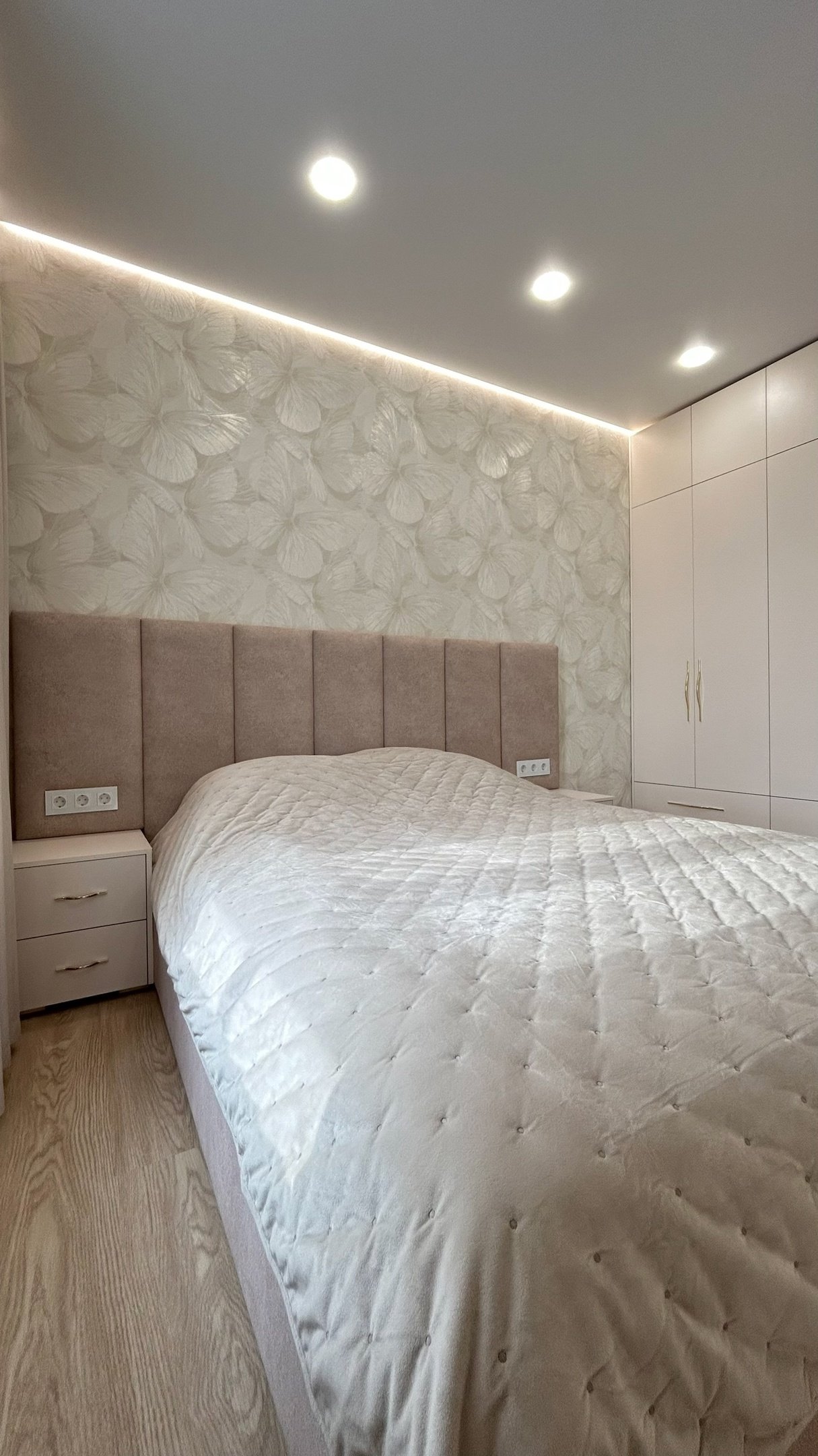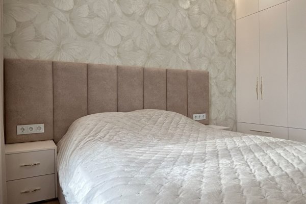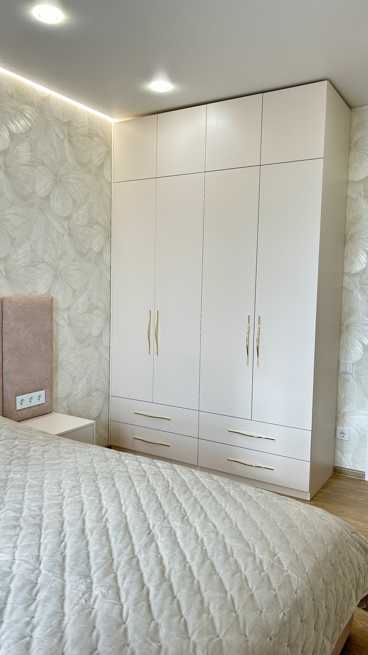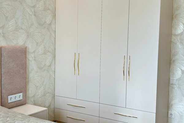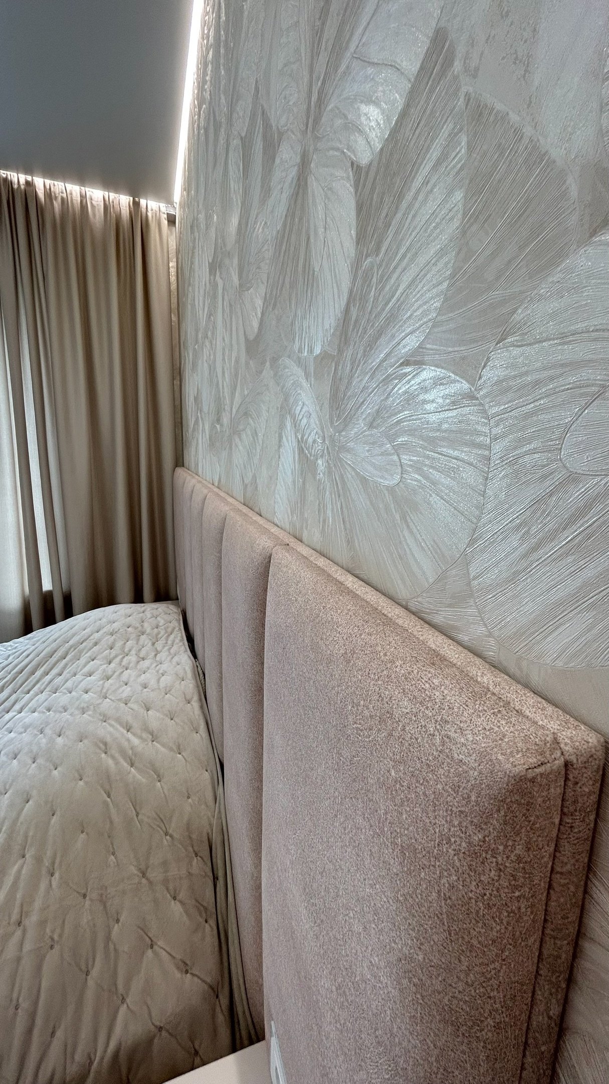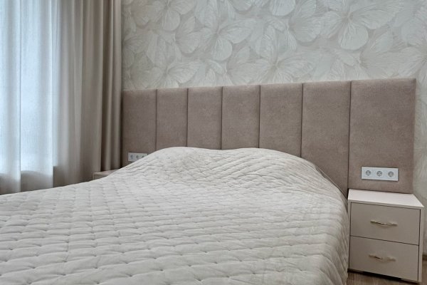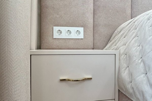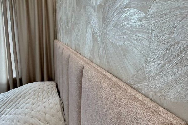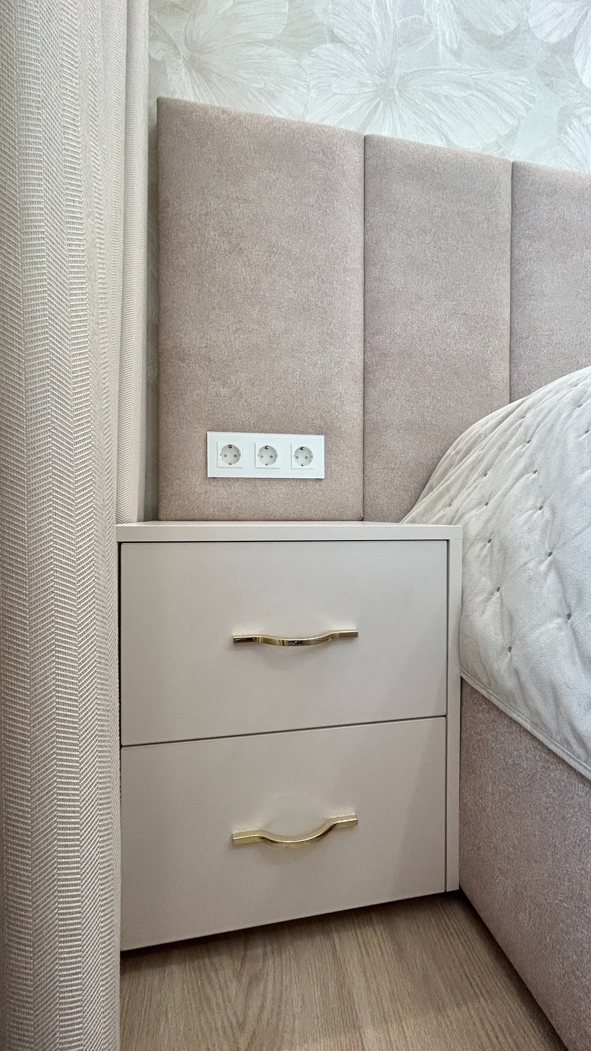 Шкаф 4-х створчатый: ЛДСП "Миндаль". Фурнитура FIRMAX . Стоимость образца на фото - 75000 руб. Прикроватные тумбы: ЛДСП "Миндаль". Фурнитура FIRMAX , Стоимость образца на фото - 14000 руб (пара). Кровать: Увеличенное мягкое изголовье "СТИЛЬ" с интегрированными розетками и заготовленным местом под прикроватные тумбы. Мягкие царги. Спальное место 1600*2000 мм. Подъемный механизм. Хранение постельных принадлежностей. Стоимость образца на фото - 65500 руб.