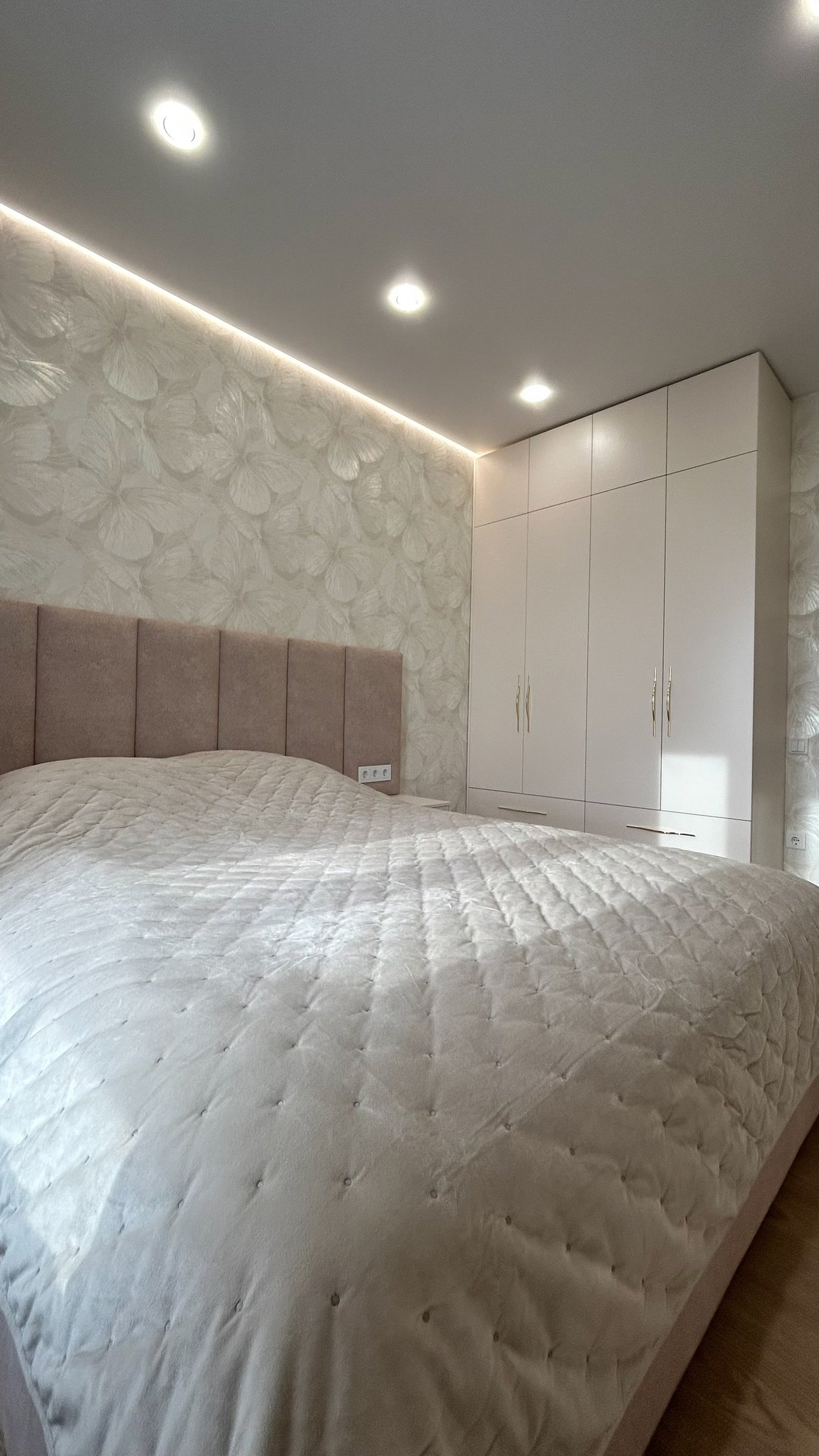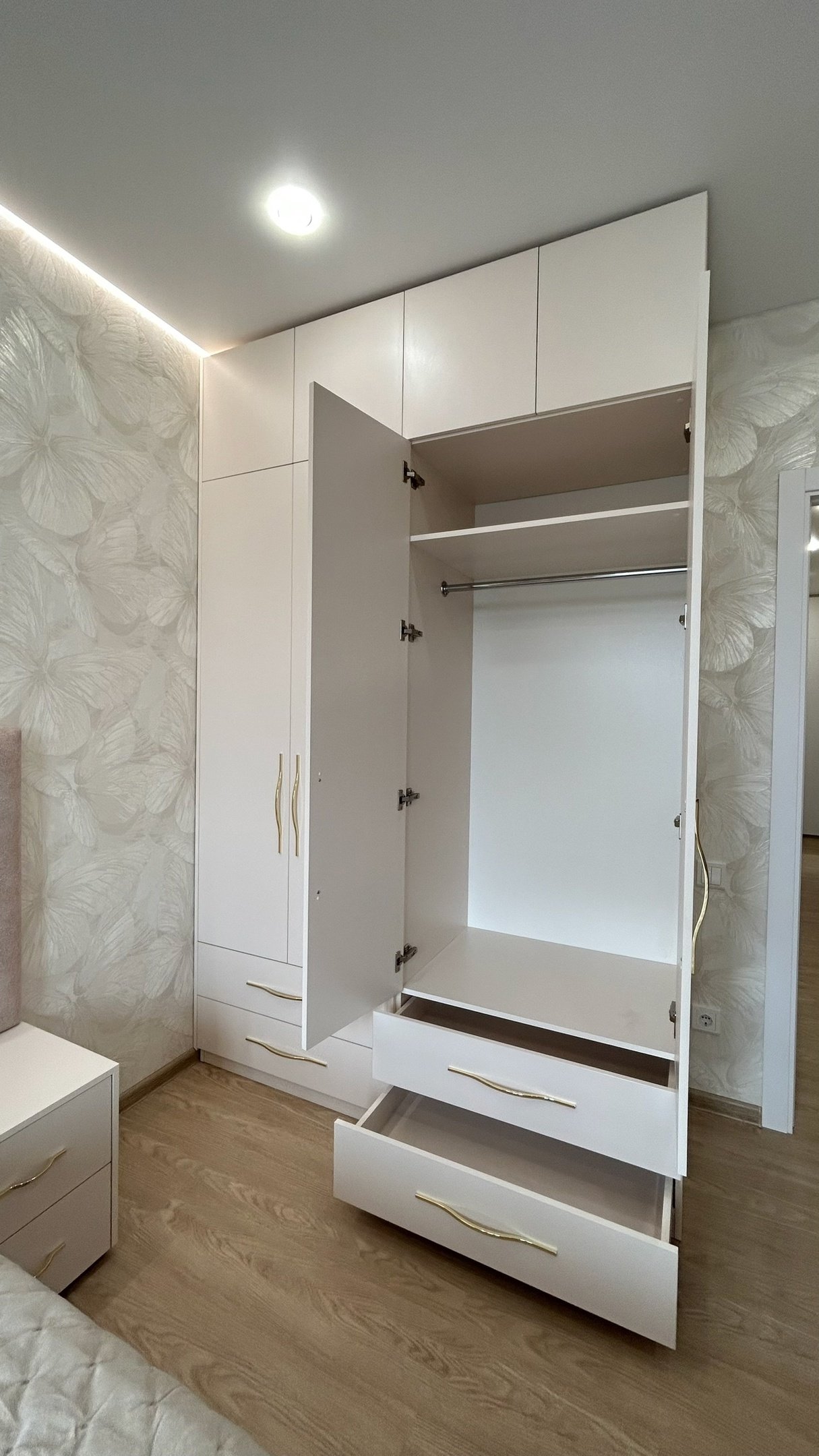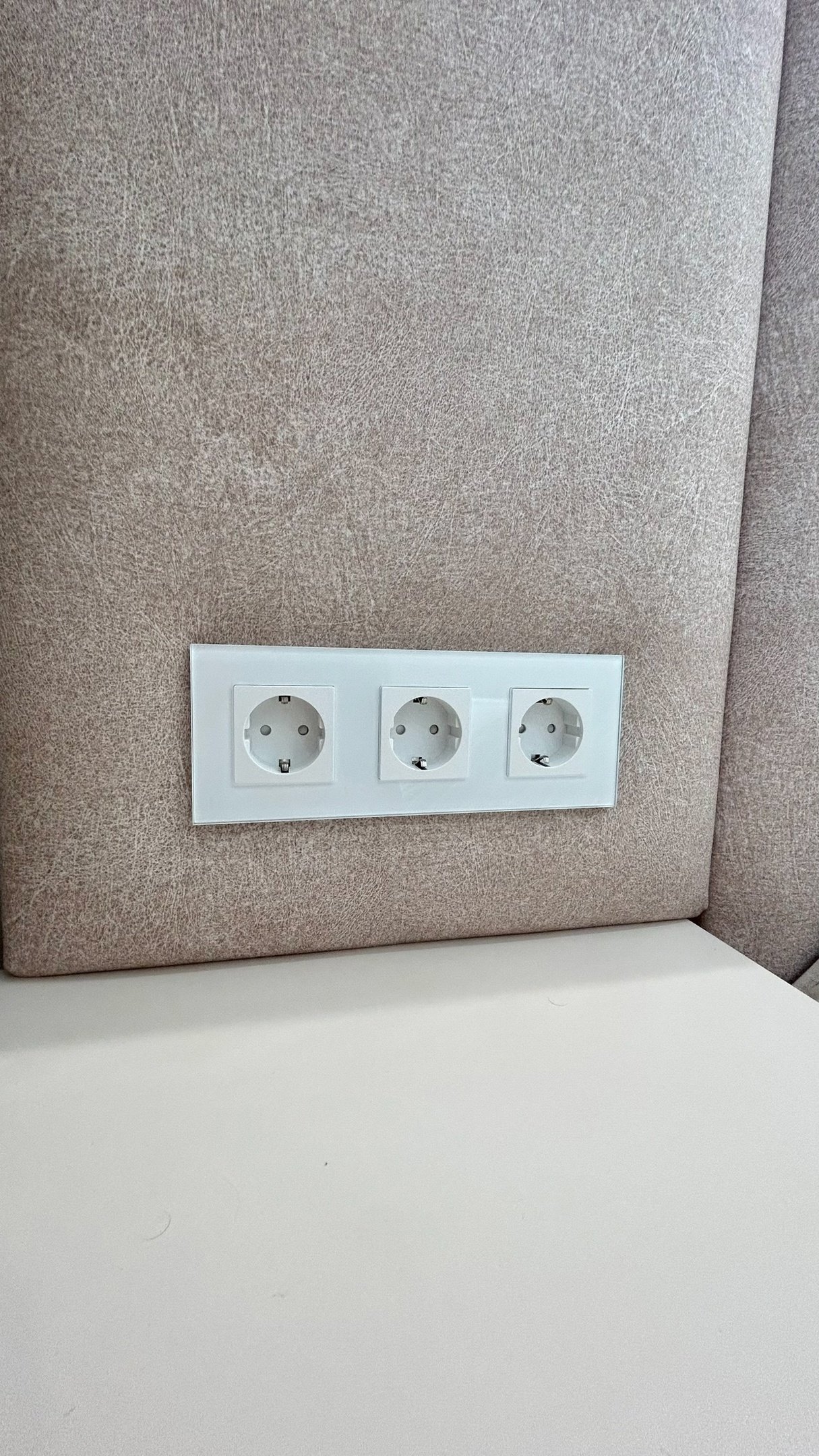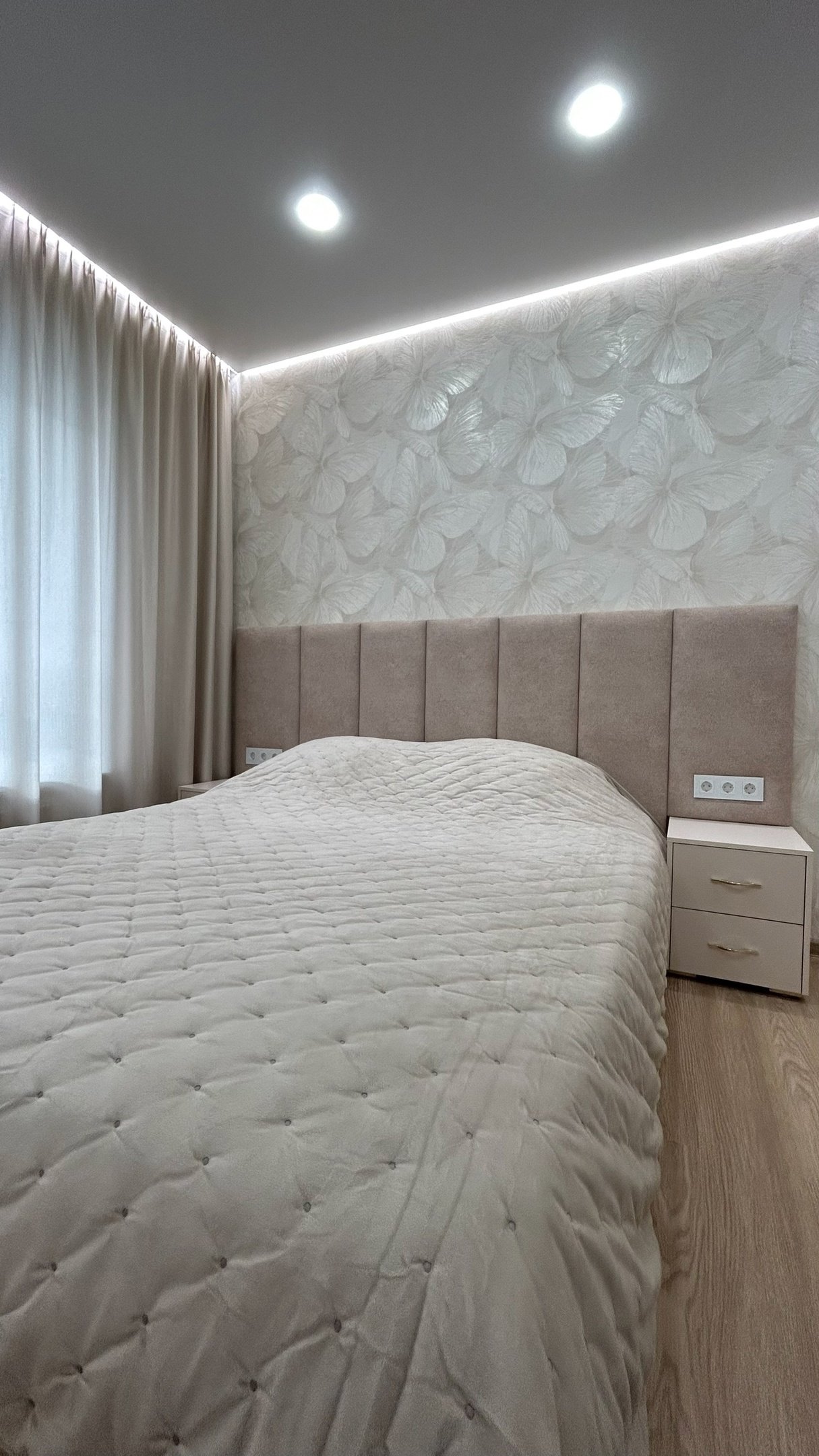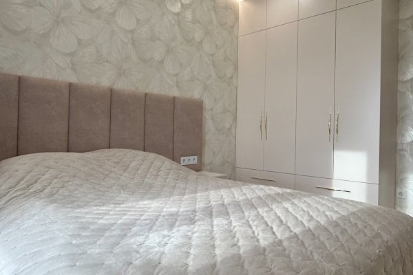 Шкаф 4-х створчатый: ЛДСП "Миндаль". Фурнитура FIRMAX . Стоимость образца на фото - 75000 руб. Прикроватные тумбы: ЛДСП "Миндаль". Фурнитура FIRMAX , Стоимость образца на фото - 14000 руб (пара). Кровать: Увеличенное мягкое изголовье "СТИЛЬ" с интегрированными розетками и заготовленным местом под прикроватные тумбы. Мягкие царги. Спальное место 1600*2000 мм. Подъемный механизм. Хранение постельных принадлежностей. Стоимость образца на фото - 65500 руб.